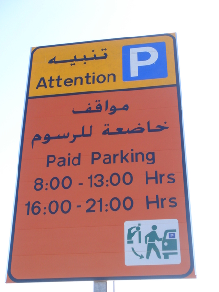 停車格的路邊,也會註明收費的時段。有次,我仔細一看,才發現,中午居然不收費耶,而且還休息三個小時之久。不知道是不是因為杜拜太熱了,所以體諒大家要開車出來用餐。我想,可能只有阿拉伯國家才會有這種措施吧,也算是不錯的福利囉!!