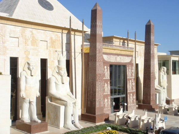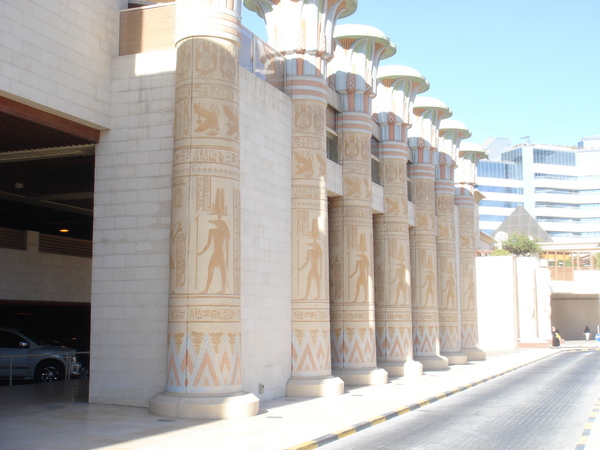 後來去,才發現原來一樓有個自動門可以走出去,一走出去,真是讓我很震驚,沒想到Wafi City設計得這麼埃及,不只有金字塔玻璃花窗(前一篇有介紹),連停車場外牆都設計得很有埃及風,不得不佩服他們的用心。