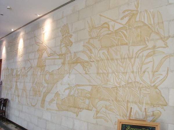 一進去就看到大廳旁的牆壁,也都是埃及風的壁畫,做到這個地步,真是令我佩服。其實,他們連屋頂都有埃及風的彩色壁畫呢,不過被樓梯檔住了,沒辦法拍到全景。