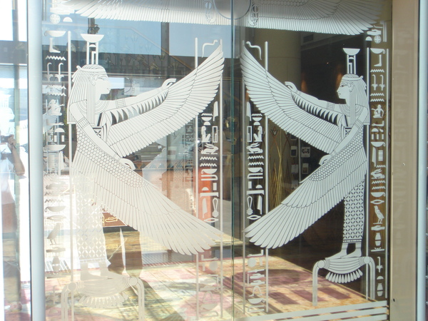 他們連玻璃自動門都不放過,上面也要有埃及風的圖案才行。