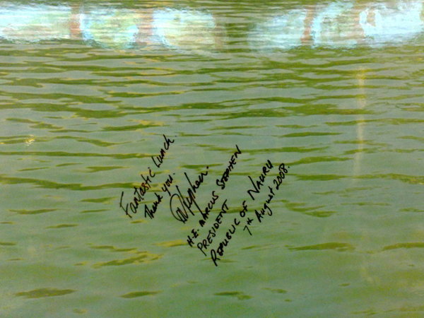 坐回位子上,Brian抬頭一看,發現原來我們桌子正上方的台中公園風景照片中,就有前天來吃飯的諾魯總統簽名。