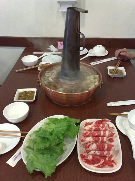沒有等很久,酸菜白肉鍋的鍋底就來了,鍋底是250元,但只有酸白菜和五片左右的白肉,其他料都要自己再加點。我們點了雪花牛肉(200元)、凍豆腐(60元)、鴨血(40元)、魚餃(40元)、川丸子(60元)、大陸妹(40元),因為它送來時,都直接把料加進火鍋裡,所以來不及拍照,只照到牛肉和青菜。我忘了拍菜單,不知道價錢有沒有記錯,印象中的價錢是這樣。